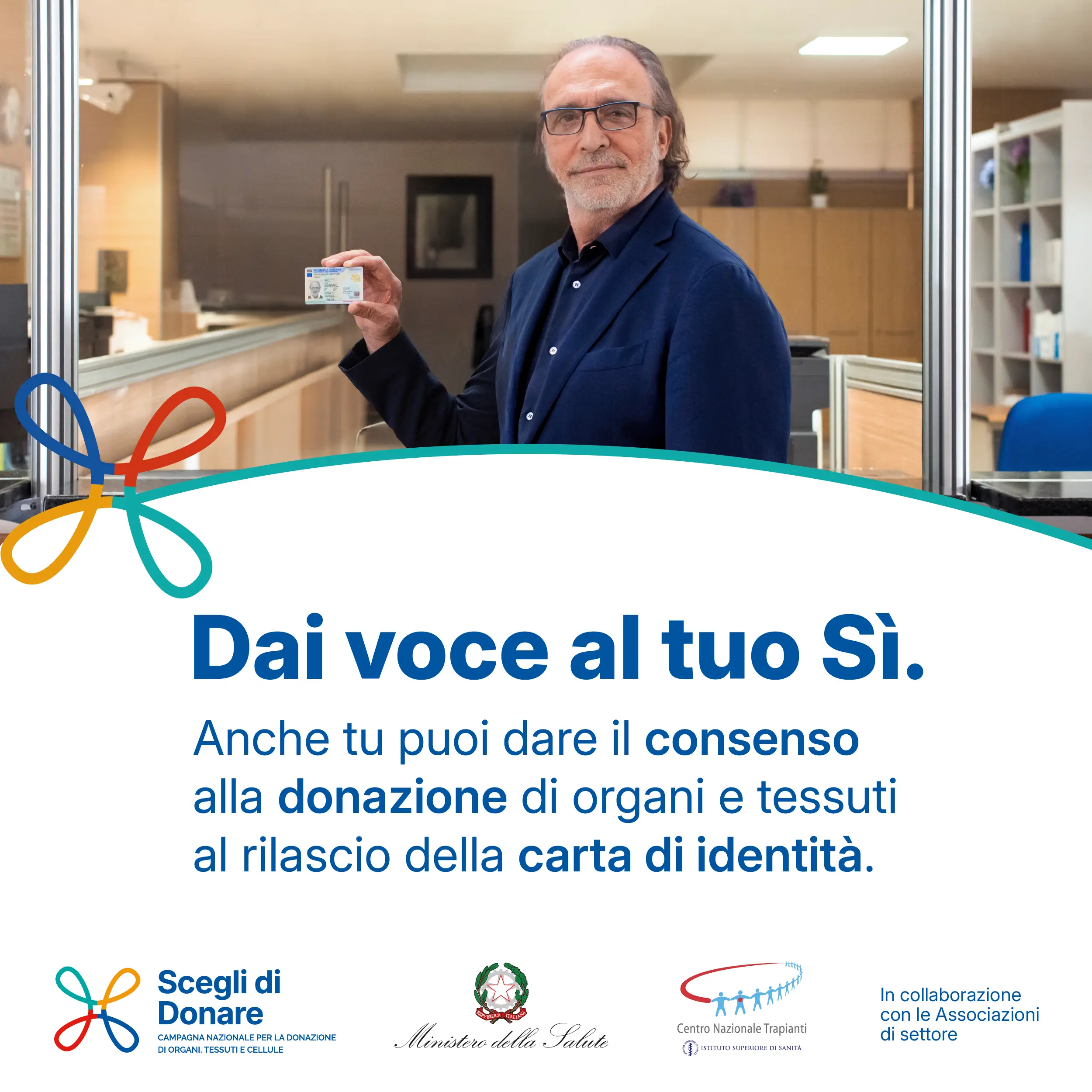 Testimonial della campagna è Luca Ward, protagonista del nuovo spot TV e radio, che invita a dare voce alla propria scelta: dire Sì alla donazione quando si rinnova la carta d’identità in Comune.